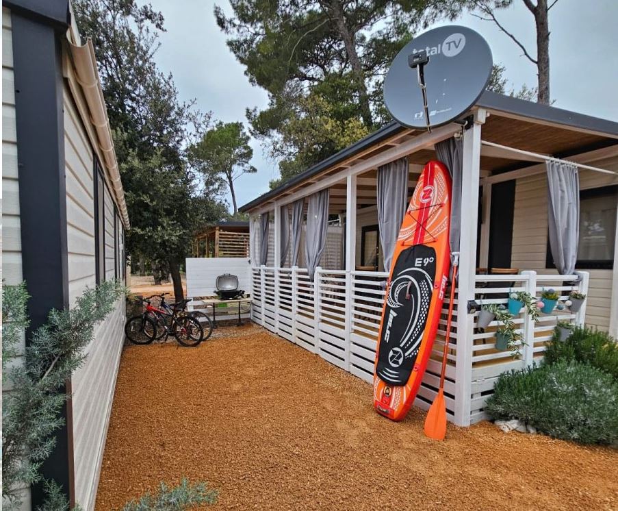 Dokonalý chorvatský úkryt v borovicovém lese v kempu Soline, Biograd na Moru. Užijte si dovolenou s veškerým komfortem domova v našem útulném a moderně zařízeném mobilheimu, který se nachází v klidné, stinné zóně vyhlášeného kempu Soline, jen pár minut chůze od nádherné jadranské pláže.